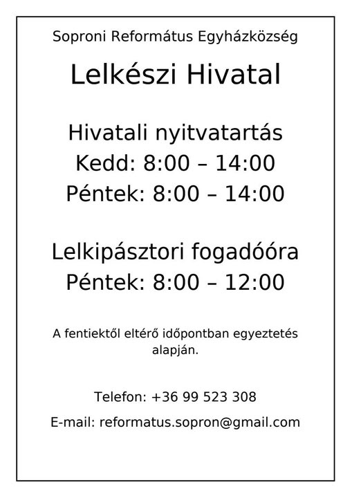 Soproni Református Egyházközség Lelkészi Hivatala: